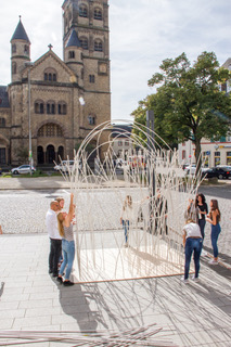 Im Workshop bauen Schülerinnen und Schüler gemeinsam mit Studierenden begehbare Raumstrukturen im Maßstab 1:1. Dabei erleben sie direkt konstruktive, statische und gestalterische Grundlagen des Bauens. Die Auseinandersetzung mit Raum, Material und Form fördert räumliches Vorstellungsvermögen, Teamarbeit und Kreativität. Die Ergebnisse werden durch Zeichnungen und Fotografien dokumentiert und reflektiert.